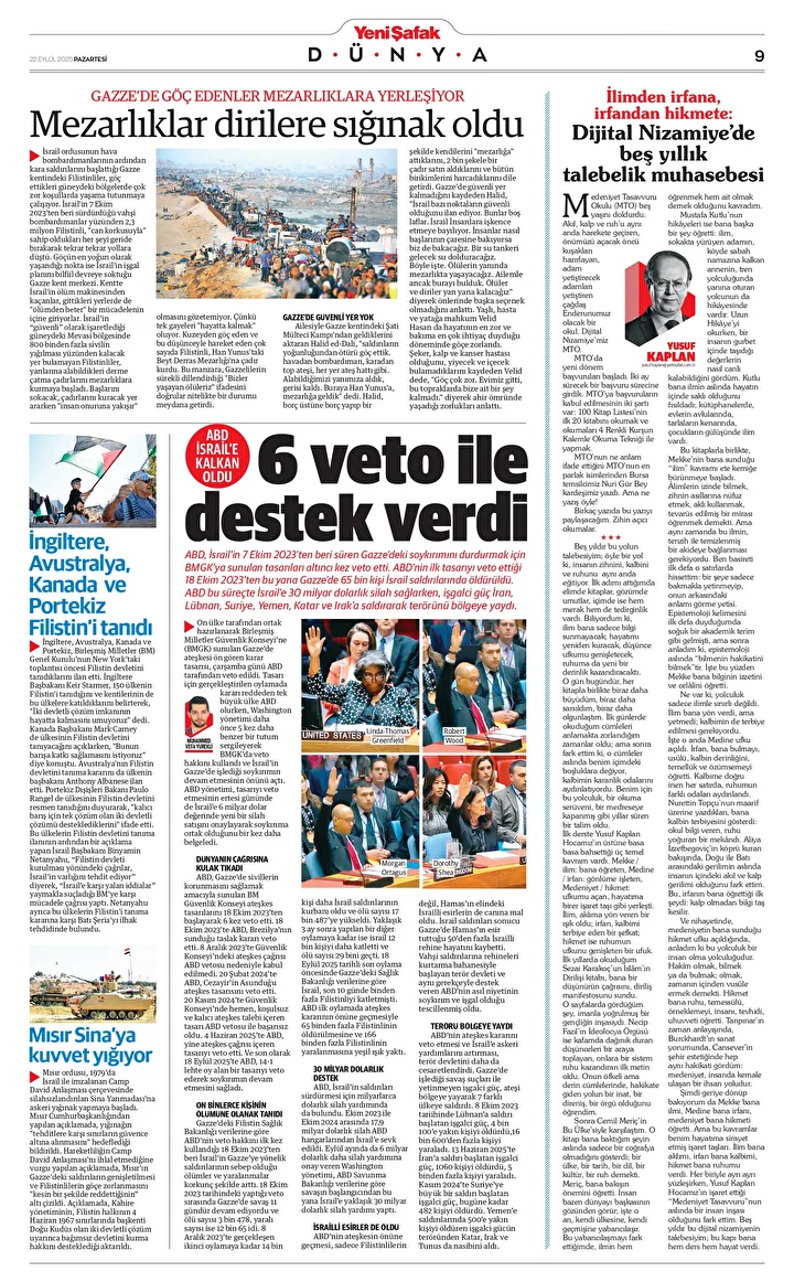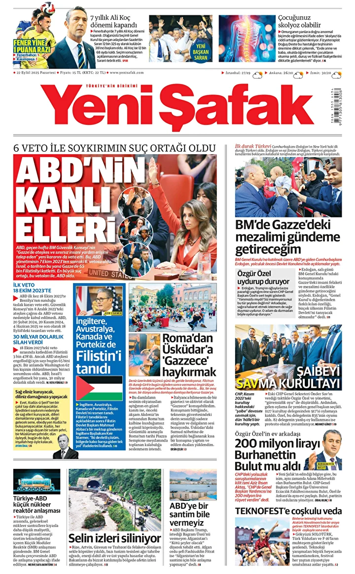 Yeni Şafak Gazetesi’nin 22 Eylül 2025 tarihli birinci sayfasında yer alan manşet ve haberler…