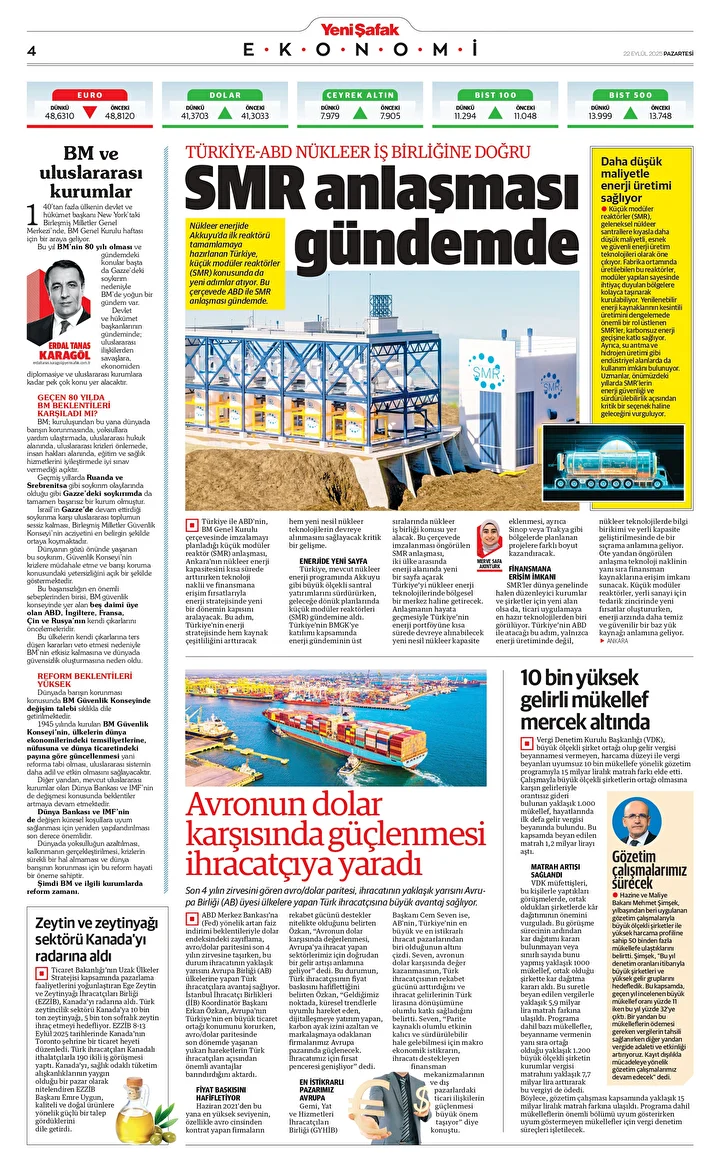 Türkiye ile ABD arasında, geleneksel nükleer santrallere kıyasla daha düşük maliyetli, esnek ve güvenli enerji üretim teknolojilerini içeren Küçük Modüler Reaktör (SMR) anlaşması gündemde. BM Genel Kurulu çerçevesinde ABD ile anlaşma yapılacağı ifade ediliyor.