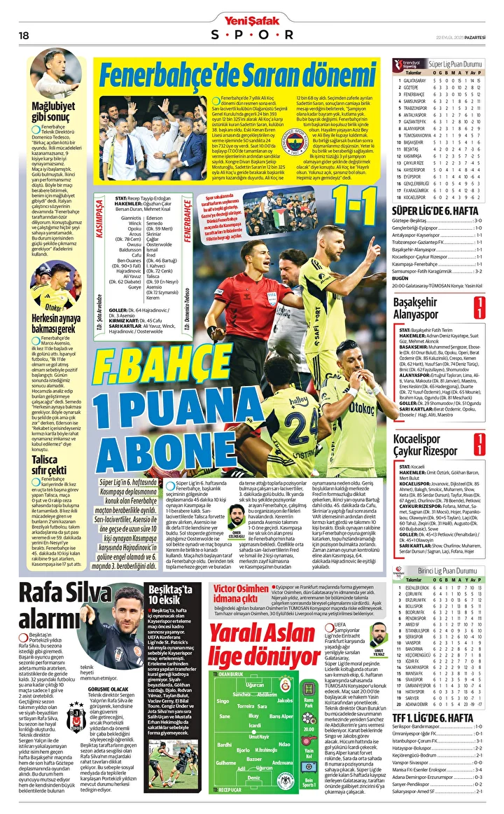 Süper Lig’in 6. haftasında Kasımpaşa deplasmanına konuk olan Fenerbahçe maçtan beraberlikle ayrıldı. Sarı-lacivertliler, Asensio ile öne geçse de uzun süre 10 kişi oynayan Kasımpaşa karşısında Hajradinovic’in golüne engel olamadı ve 6. maçında 3. beraberliğini aldı.