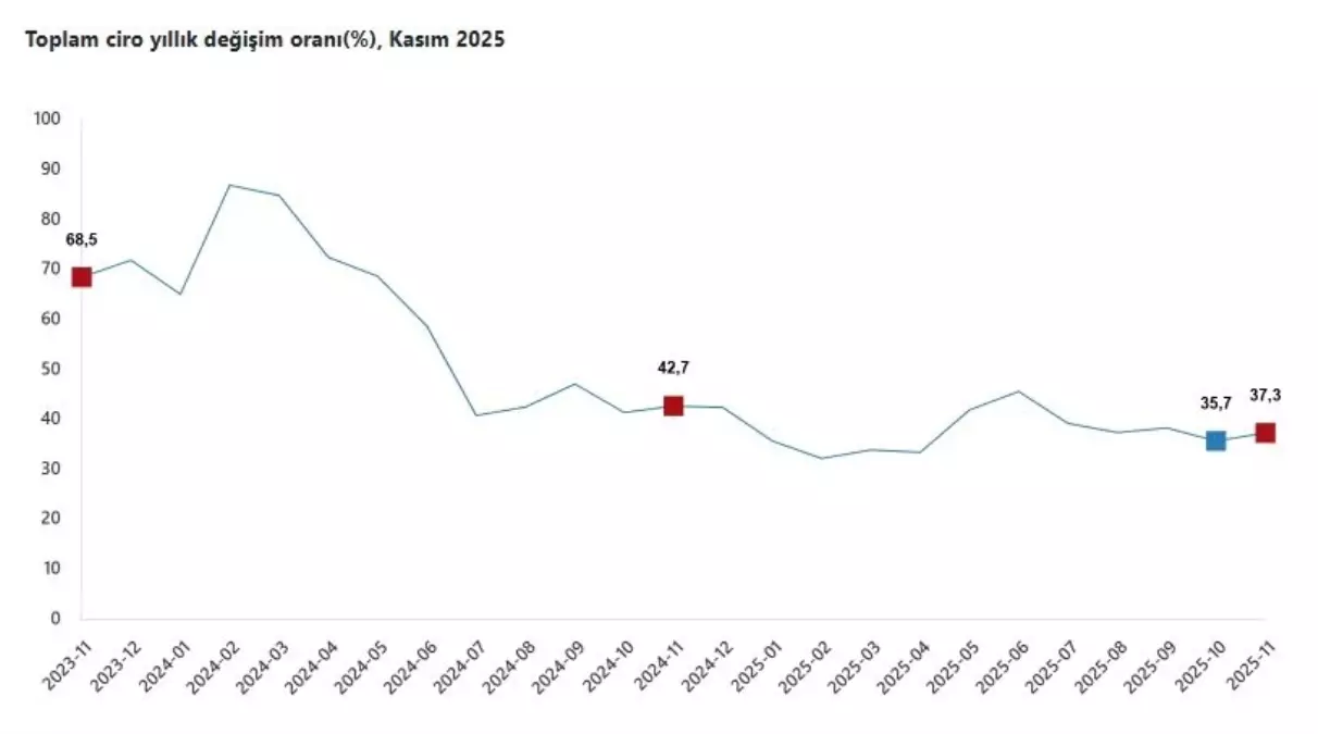Türkiye İstatistik Kurumu (TÜİK), Kasım ayında sanayi, inşaat, ticaret ve hizmet sektörlerinde toplam cironun geçen yıla göre yüzde 37,3 arttığını duyurdu. Aylık bazda ise ciro yüzde 3,7 artış gösterdi.