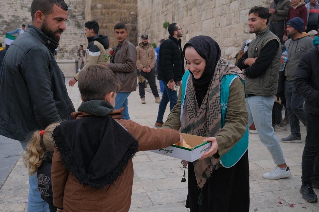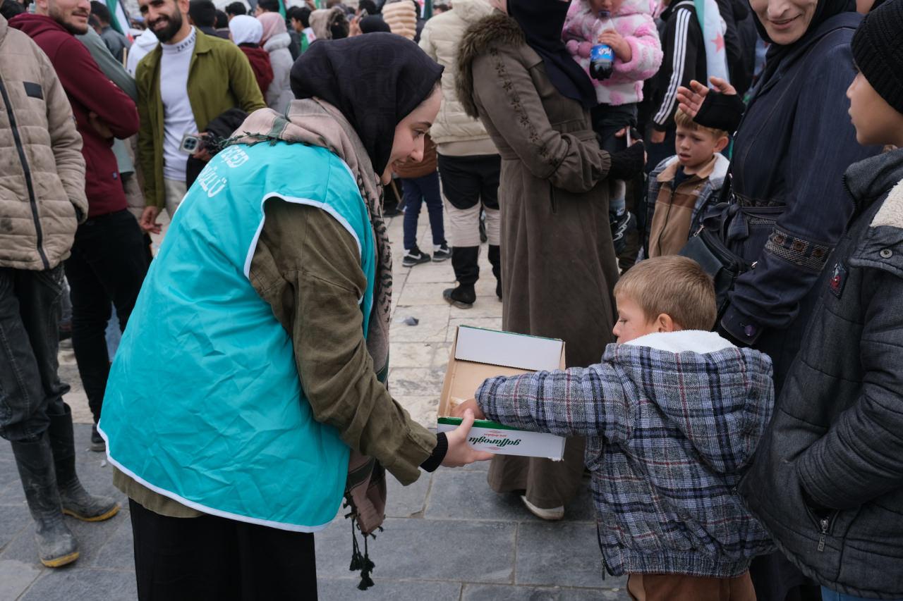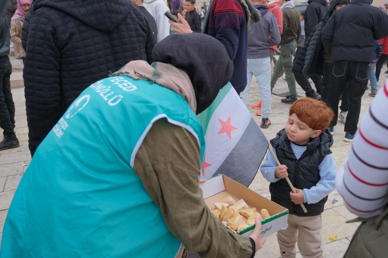 Aynı zamanda YEÇED, gün içinde yapılan kutlamalarda Suriye halkına tatlı dağıtımında bulunarak sevinçlerine ortak oldu.